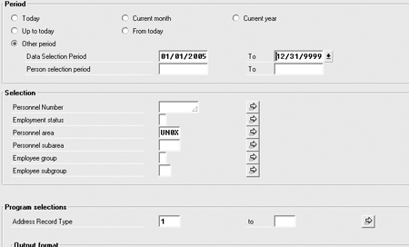 In the example of the query selection screen, put in the personnel area for the Union X employees as well as the Address Record Type 1 for permanent address. The period should be set to 01/01/2005 to 12/31/9999 (Figure 6).