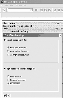 Now the system prompts you to create a new Word document. Merge the data into a current Word document, or use an existing Word document (Figure 8). Select the button you see in Figure 7 for Form letter processing with MS Word, as you will write the form letter with the merged data. No password is required to merge this into a Word document.