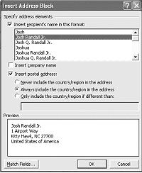 Begin with the address block. You can state how you want the user’s name to appear (Figure 9). To map the rest of the address information, select the Match Fields button.