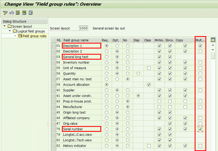 By selecting check boxes in the Multi…. column, you can indicate which fields can be entered during the creation of multiple assets. In the example shown in Figure 4, the fields Description 1 and Serial number are set and ready for input during creation of multiple assets. Because Description 1 is a mandatory field, it will be mandatory in all assets. In this case, Serial number is optional, so it will also be an optional field for the multiple assets.