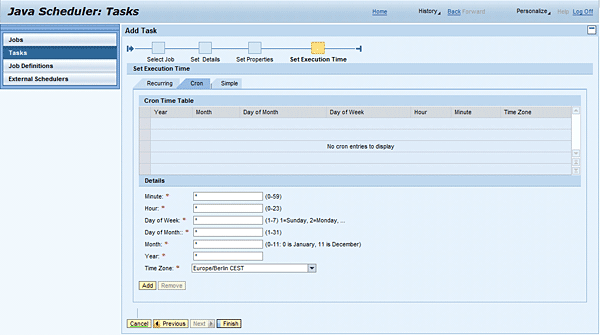 To do that, you define the time zone (in the Time Zone drop-down list), and the start and end dates and time conditions for one job start or run (see the Start Date, End Date, and Time input fields in Figure 12). Initially, the dates and times are set to the current date and time; you can modify them freely. The Time Zone field is initially set to the time zone configured on SAP NetWeaver AS Java. You can achieve the semi-periodic execution if you define many start conditions that are listed in the condition table (see Simple Time Table).