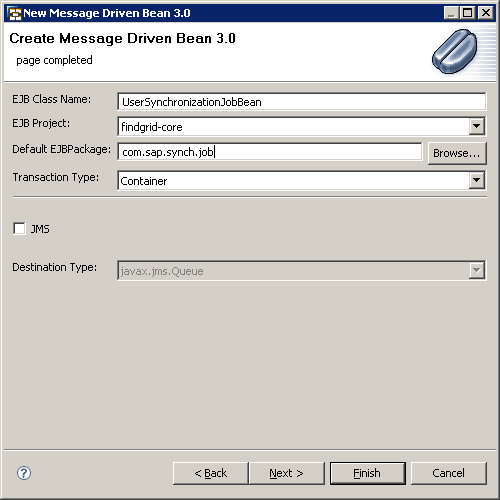 Enter the EJB Class Name (e.g., UserSynchronizationJobBean), the EJB Project name (e.g., findgrid-core), and the Default EJBPackage (e.g., com.sap.synch.job). Because the Java message-driven beans are running in the EJB container (Figure 1) you should not modify the transactional settings that are proposed by the wizard in the Transaction Type drop-down (Figure 22).