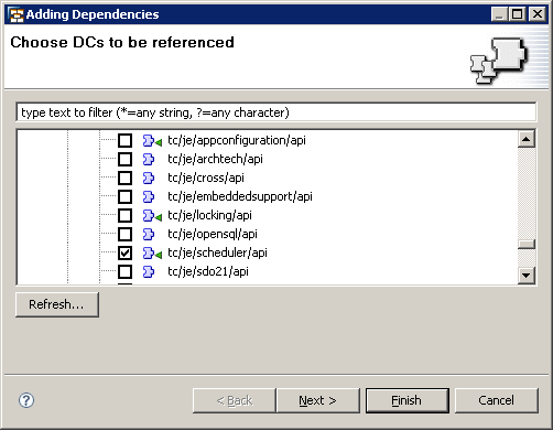 If your SAP NetWeaver Developer Studio is integrated with SAP NetWeaver Development Infrastructure (specifically with the Design-Time Repository [DTR] and Central Build Server [CBS] pieces), you should set the project references in the SAP NetWeaver Developer Studio - Development Infrastructure view. To do that, select the EJB project and navigate to Component Properties > Dependencies and add the new dependency (e.g., tc/je/scheduler/api) to Java Scheduler (Figure 23).