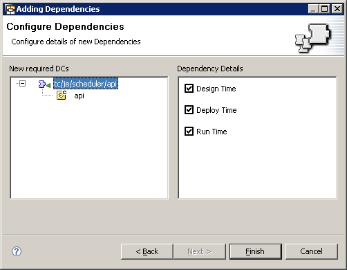 After you click the Next button, you need to define if the dependency is used at Design Time, Deploy Time, or Run Time (Figure 24). To avoid problems, you should select all types of dependencies and click the Finish button to activate the modifications.
