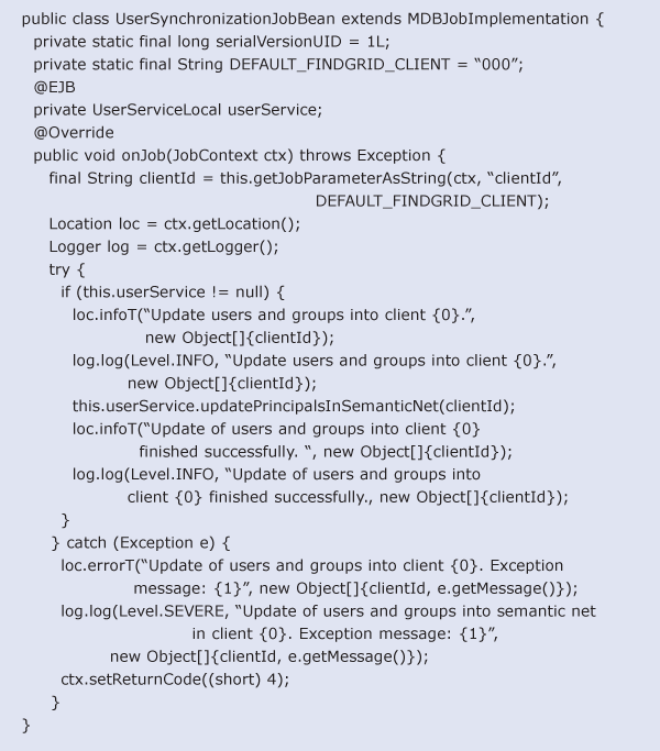 Now you can start implementing the business logic that is provided in the public method onJob(JobContext ctx). Figure 26 shows you an example implementation of the business logic that is calling the existing java bean to update the users and groups. (The detailed description of user and group update is outside the scope of this article.)