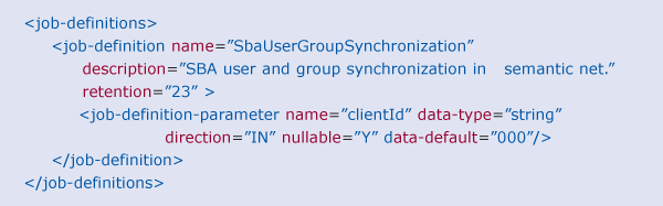 Figure 4 presents the Job Definitions view with an example job definition named SbaUserGroupSynchronization provided by the sap.com/is~findgrid-core-ear business application.