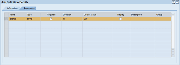 After the job definition is selected, Figure 4 shows the Job Definition Details section that provides you with the name of the job, its short description, its retention period, and the name of the business application that provides the job definition. The Parameters tab in the Job Definition Details section (at the bottom of the screen in Figure 5) presents you with the list of job parameters — its name, type, direction (the IN value is used for input parameter and the OUT value is used for output parameter), default value, description, and display indicator (which defines if the parameter is visible or configurable in the task scheduler while defining the job instance).