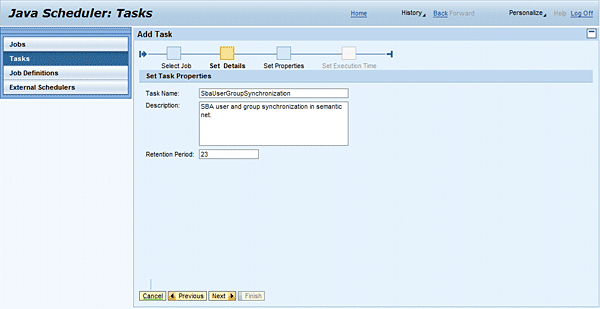 In the next step, you define the task name, its description, and its retention period. The Retention Period parameter defines in days how long the particular job instance (executed task) remains in the list of jobs after the job is completed. (I’ll talk about this more in the Job Execution Results section.) As you can see, the wizard proposes the initial or default values that are defined by the job provider in the job definition and you can freely modify them.