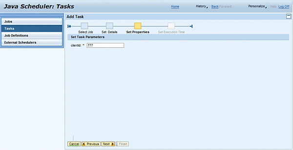 Figure 8 presents the next step, in which you define the value of the job parameters that are used for the execution of the particular job instance. In this example, the job SbaUserGroupSynchronization defines only one input parameter clientId (see also the job definition parameter in Figure 5) which is defined and understood by the particular business application. In this example business application, the clientId parameter is used as a data container. This means the Java business application uses a similar data separation mechanism that the ABAP system uses (client separation).