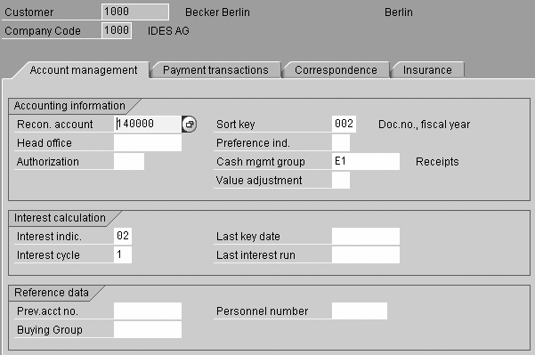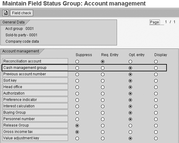 Within these transactions, select the account groups you use for your customers and vendors. After you activate Cash Management, you must be able to enter a value in the field Cash management group of the master data to assure the system transfers data from the FI, MM, and SD modules to Cash Management. Therefore, you must make sure that the field Cash management group is either optional or required. Figure 1 shows the field Cash management group set to optional for customer account group 0001. The field is part of the Account management view of the master data.