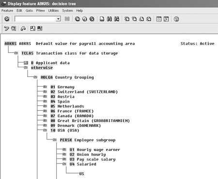 Let’s review the ABKRS feature to show how a feature works. Type ABKRS in the Feature field (Figure 1). Once you press the Enter key on your keyboard, the long name of the feature ABKRS appears on the screen — ABRKS Default value for payroll accounting area. Leave the default button set to Decision tree.