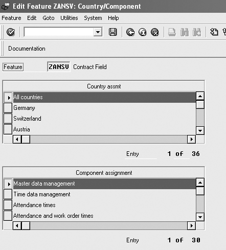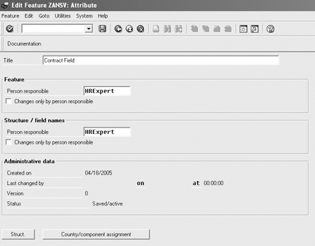 The same logic applies to the structure/field names. If you wish to see what structure the feature is based on, you can select the Struct. button (Figure 3). To view what country or HR component can use this feature, select the Country/component assignment button. For an overview of what the attributes screen looks like, refer to Figure 3.
