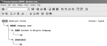 Step 8. Complete the decision tree. On the main feature interface screen transaction PE03 (Figure 1), type the name of the custom feature, ZANSV, select Decision tree and click the Change button. Let’s say that if an employee is in the CABB company code, their contract field will be 10. If they are in any other company code, then their contract field will be 99.