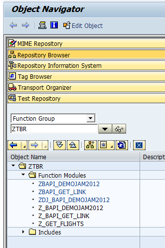 Now that you have confirmed that the function module you created works, the next step is to convert the function module into a Web service. To do this, start transaction code SE80. In the drop-down field in Figure 11, select Function Group, and then in the next field select the name of the function group you selected earlier, in this case, ZTBR. Press Enter.