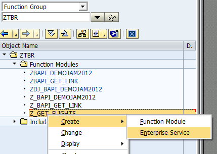 Save the function module and activate it as you did before (Figure 12, not shown in this view). Right-click Z_GET_FLIGHTS, and in the pop-up screen that appears, select Create > Enterprise Service (Figure 13).