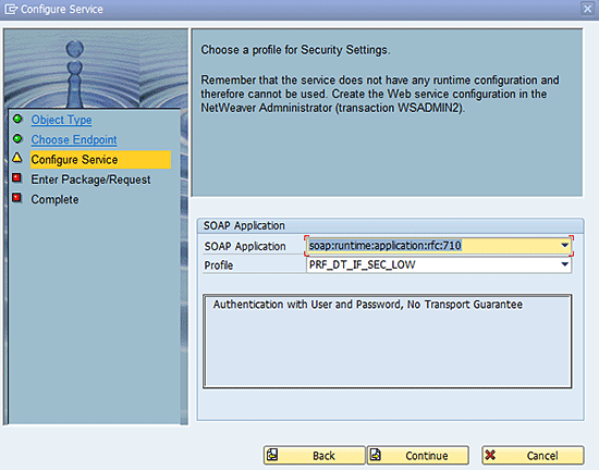 In the screen in Figure 16, you have to choose a security profile. Enter PRF_DT_IF_SEC_LOW in the Profile field. When consuming the Web service, you have to provide your username and password to get access to the Web service, which I discuss later in this article. Click the Continue button to go to the next screen (Figure 17).