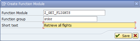 Click the Create button, fill in the Function group field (ztbr) and the Short text field (Retrieve all flights), and click the Save button (Figure 2). Function groups either are already available in your system or they have to be created. When creating a function group, you have to provide a package. This package is already available in the system.