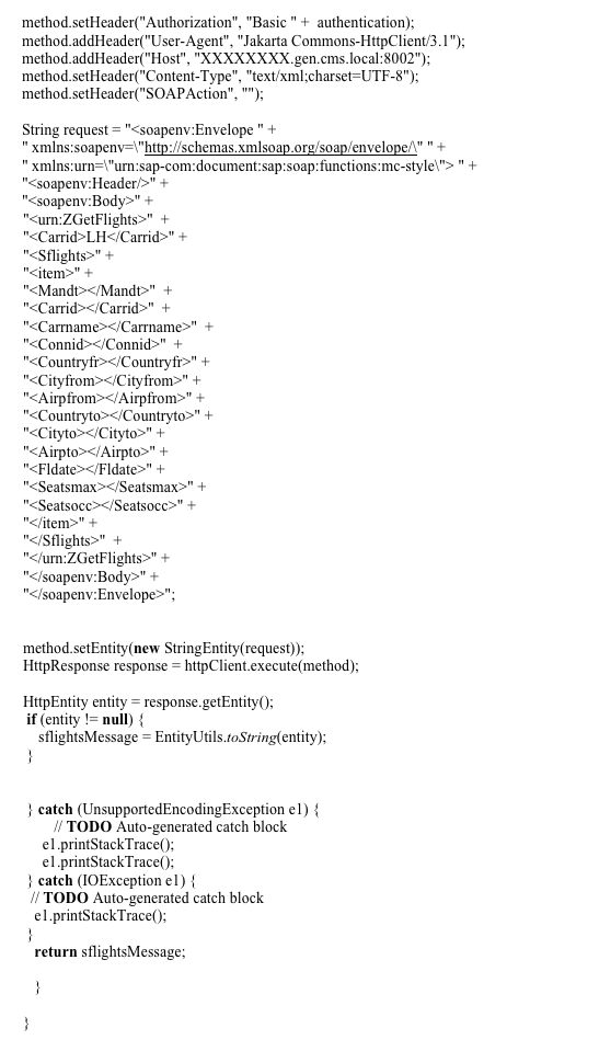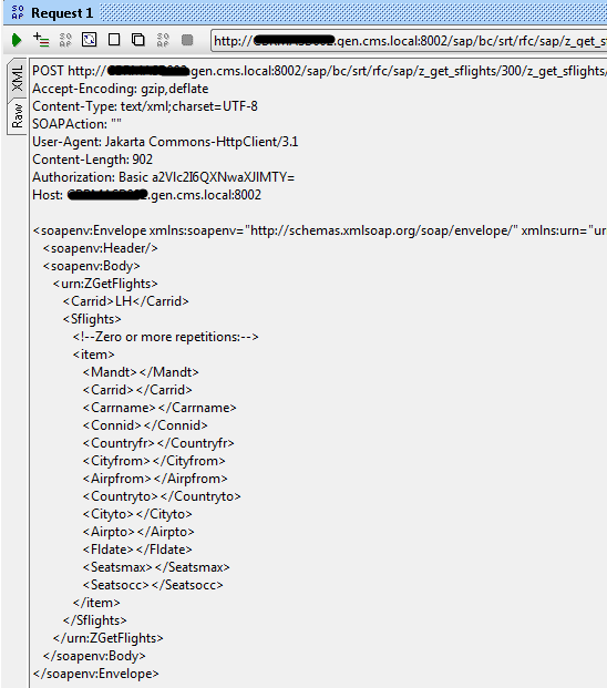 This is the important part. The HttpPost string is the one you see in the SOAPUI request 1 screen (Figure 38): POST https://xxxxxxxxx.gen.cms.local:8002/sap/bc/srt/rfc/sap/z_get_sflights/300/z_get_sflights/get_sflights"); String authentication = android.util.Base64.encodeToString(cred.getBytes(), android.util.Base64.NO_WRAP). .