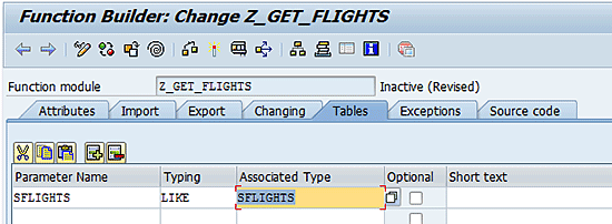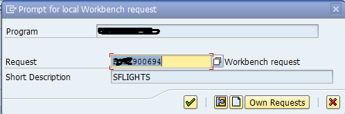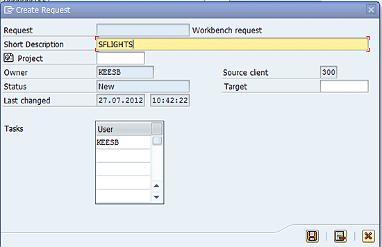 When saving the function module, you have to create a transport request. To do this, first put the transport name (SFLIGHTS) in the Short Description field (Figure 6) and click the save icon.