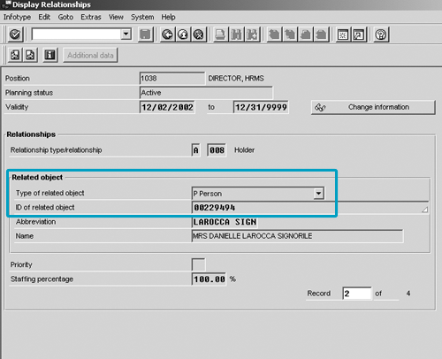 If you use this same method to load your supervisor relationships, be sure to use the same begin and end dates for the new relationship infotype as exists for the person/holder relationship (A 008 P). This ensures that your PD relationships stay in sync.