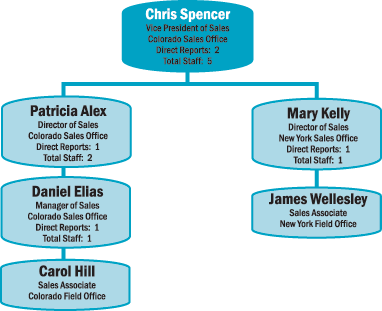 We did not want to manually designate page breaks each time we created org charts. Most packages offered the ability to save the import designation of page breaks, but it was hard-coded based on the employee’s name. Therefore, it would require frequent changes. Furthermore, we had already stored a record in PD for any position that we wanted to appear on its own page, along with an identifier of how many levels to go on that page. Figure 2 shows a record for the vice president of sales position and an indicator to go down three levels. Because we already had this data stored, we were disappointed that even the most expensive packages were not flexible enough to read it and produce the output.