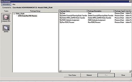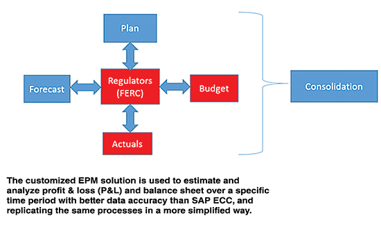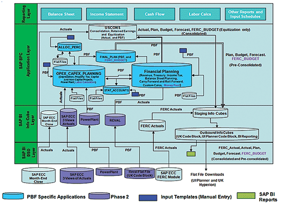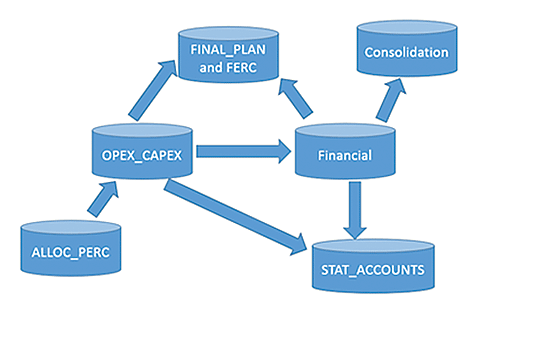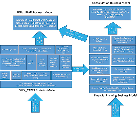 Figure 5 provides a general overview of the architecture associated with the customized EPM 10.0 solution and describes the data flows associated for creating balance sheet, income statement, performance planning, budgeting, forecasting, and consolidation operations. Note that the FINAL_PLAN model receives information from the Financial and OPEX_CAPEX models. This business model is used to generate the regulatory reporting associated with FERC on a pre-consolidated basis.