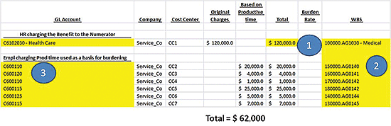 1. A cost center is charged benefits to medical charges for $120,000, and associated with both a G/L and WBS element to cost center CC1. This charge represents the numerator in the calculation of the distribution value as any other accounting calculation of overheads.