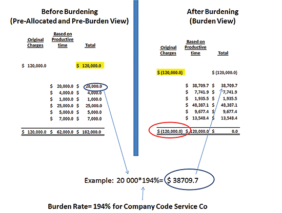 Figure 11, the burden rate is stored in the customized EPM 10.0 solution as 1.94 and is stored to the rate calculated for each individual company where the criteria meets the numerator and denominator G/L account groupings. The distributions occur automatically, and they are applied to the data to perform the distribution as shown in