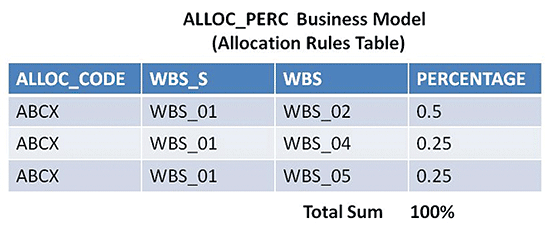 - ALLOC_PERC: This model stores the simplified allocation rules using ECC tables as the source. These allocation rules are populated automatically using BW or BI and SAP HANA integration. The largest number of allocation rules for a particular client is one million that are read line by line depending on the properties set up in the master data fields in the dimensions involved as part of the allocation process.