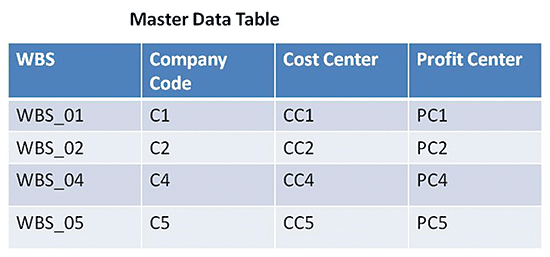 Master data element for each of the WBS elements identified (Cost Center, Company Code, and Profit Center)