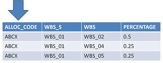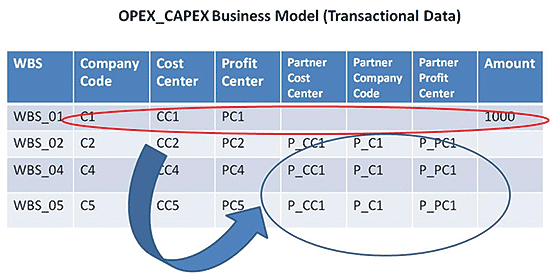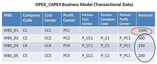 3. The system matches the allocation code identified with the Sender WBS (WBS_01), and the receiver WBS (WBS_02, WBS_04, and WBS_05) along with their respective master data elements of cost center, company code, and profit center. At the same time, the system identifies the allocation code that matches the rule defined in the ALLOC_PERC table, and this match is identified in the transactional data stored in the OPEX_CAPEX Business Model as shown in