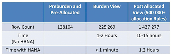 Of course, the most important point is performance. By performance, I mean time. Certainly, the time from a previous process for allocation, even though it sounds simple, was extremely expensive from a server perspective. This process could take up to 10 to 15 hours to complete without having SAP HANA as the database. Also, the data was matched side by side with the ECC allocation results for a particular company, and the match is perfect. Therefore, you can choose to run your allocations for actuals in the customized EPM 10.0 solution if you prefer. After the implementation of the performance improvement elements of SAP HANA, this process with the same data volume was reduced to 1.2 hours with more than 500,000 allocation rules. For more information, refer to the article titled “