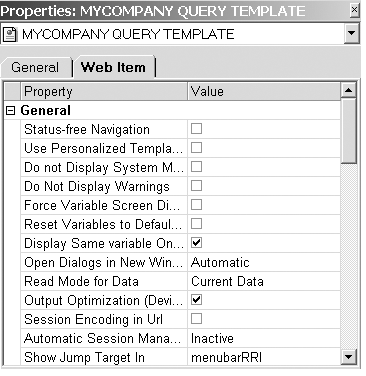 A number of standard template attributes are customizable along with the context menu available in the template. Set the check boxes on the Web AD Web Item tab under the General heading to define various attributes (Figure 2). These attributes determine a range of functions, from whether warnings will be displayed to the read mode for data to device-based output optimization.