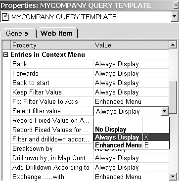 While the context menu in the template supports a host of features, some may not be relevant to your end users. The Web Item tab allows you to customize context menu settings and configure each entry by setting flags in the Entries in Context Menu section (Figure 3). Set the Always Display option to make the item available in a report’s basic menu or designate it to be displayed only in the Enhanced Menu. Web items can also be hidden from users altogether using the No Display setting.