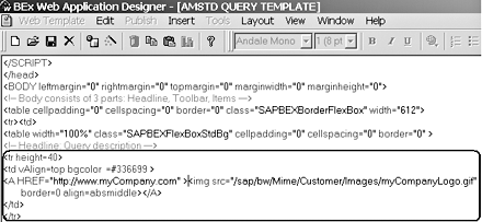 You can add a logo or other graphical element to your query template in two steps. First, upload the image to the Customer/Images directory in the MIME Repository using transaction SE80. Then, add a link to the image in the headline section of your Web template as shown in Figure 1. This method gives the you ability to link standalone BW reports to your company portal, BW report menu page, or any other Web page you choose.