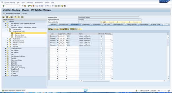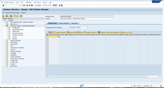 As you move from project mode to operations mode, the content of your project is transferred to a solution and the logical components identified in the project are aligned to the physical infrastructure definitions to form a solution. The solution also contains detailed information about the technical activities going on in the different systems in your system landscape. Information from the Landscape Management Database and the Service Data Control Center is integrated into the solution as well.