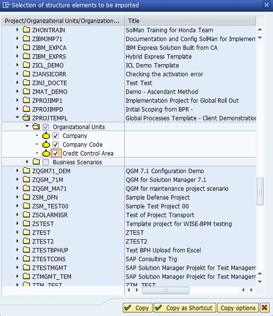 Select the first row in the Structure tab and prompt the system by pressing F4 or clicking the dropdown icon. The Project Selection window opens to the Organizational Units section. Figure 6 shows the selection of the three Organizational Units I want to import into my solution from project ZPROJTEMPL.