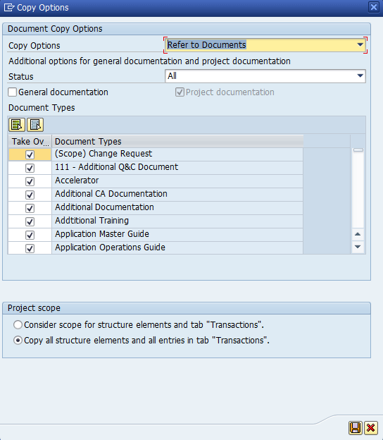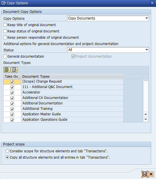 The next section in the Copy Options pop-up allows you to control which documentation tabs are used to source the design-related documentation from the project. By default, Solution Manager looks for content only on the Project Documents tab. If you want to get documentation from the General Documentation tab, you must select the check box for the General documentation. Be aware that choosing this check box could result in duplicate documents in the solution if the source project has the same document on the General and Project tabs.