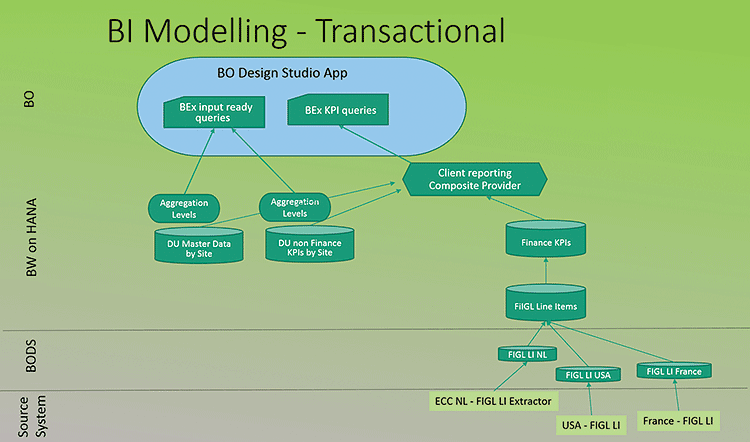 The CompositeProvider has to connect the underlying DSOs (e.g., the direct-update DSOs together with the FIGL transactional ADSO) in a union. Some of the key fields that may be used for connectivity are Site, Cost Center, and Period.