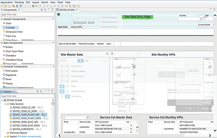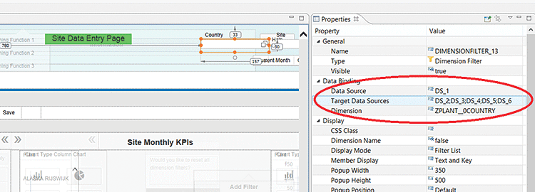 The next step is to add dimension filters and link them to queries. In the Site Data Entry area of BusinessObjects Design Studio (Figure 11), drag and drop your required dimension filters to the application screen, and bind them to the appropriate data sources.
