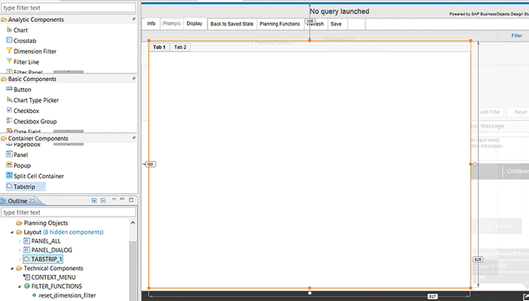 The next step is to add a Tabstrip component in the application so that you can combine and arrange objects by tab. In the Container Components section on the left, select Tabstrip (Figure 8) and drag it down to the Layout folder below to add it. This changes the screen on the right, which now shows two new tabs: Tab 1 and Tab 2.