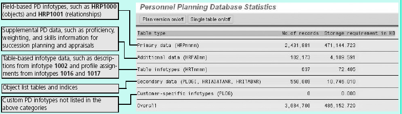 One challenge facing both database administrators and SAP HR professionals is monitoring and auditing the tables, objects, plans, and infotypes that make up Personnel Development (PD) functionality in R/3. Database requirements for PD and Organizational Management (OM) tables can grow significantly over time for even the smallest organizations, necessitating the use of regular audits of both object counts and database size.