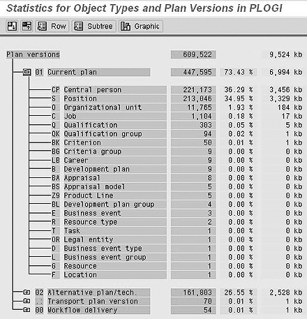 The database statistics report RHDBST00, available since Release 3.0, provides a high- level overview of database statistics for different table types in each plan version. You can access it via the standard SAP menu path Human Resources>Organizational Management>Tools> Database>Database statistics or via transaction code RE_RHDBST00. At the selection screen, indicate which of your plan versions you want included in the output, along with whether you want the output displayed by plan version or by table.