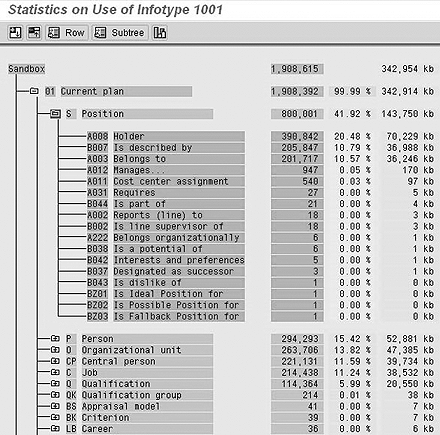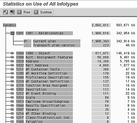 Report RHDBST40 or transaction code RE_RHVSTA30 displays statistics on all infotypes in all plan versions. When running this report, first select whether you wish the output to be displayed by infotype or by plan version. The output for this report (Figure 4) shows the total usage for each infotype in the database, with record counts and database size. The output is also broken down by plan version. RHDBST40 output does not give detail of usage by object type or subtype like the other statistics reports.