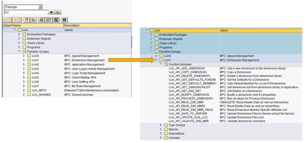 If you want to set a breakpoint to debug processing dimensions (e.g. to see why the process is taking a long time), you first need to find the function module in which to set the breakpoint. The function groups in SAP BPC are organized in the packages. For example, processing dimensions are part of Dimension Management, which is in sub-package UJA and function group UJA1 (Figure 6). Expand this function group to view function module UJA_API_PROCESS_DIMENSION, in which you can set a breakpoint to debug the entire process dimension activity.