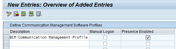 Step 1. Create a communication management profile by following menu path IMG > Customer Relationship Management > Interaction Center WebClient > Basic Functions > Communication Channels > Define Communication Management Software Profiles (CRMC_IC_MCM_CCPRO). Ensure that you check the Presence Enabled box to give users visibility into other users’ real-time presence status (Figure 2).