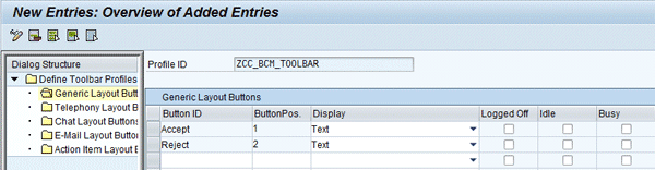 Step 2. Create a toolbar profile by following menu path IMG > Customer Relationship Management > Interaction Center WebClient > Basic Functions > Communication Channels > Define Toolbar Profiles (CRMC_IC_TLBPROF). Under the Define Toolbar Profiles folder, you have options to create various button layouts for each of your channels. For example, you can create generic layout buttons that apply to all activities (Figure 3). You can also configure the button layout for various communications toolbars (e.g., telephony and chat).