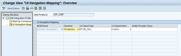 Step 5. Specify any actions to occur on standard communication events by selecting UI Navigation Mapping on the left side (Figure 6). For each event and channel combination, specify a CRM WebClient UI object type and action to perform when the event is triggered. In the example in Figure 6, the interaction record object BT126_CALL is created and navigated to whenever a contact-accepted event occurs. You can create and specify a custom entity provider class to fine-tune the behavior (for instance, to check additional conditions).