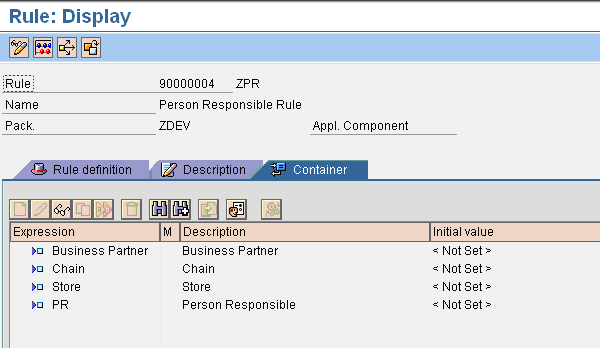 In Figure 12, I entered the technical name ZPR in the Abbr. field. You can enter any technical name that starts with a Z. Enter an appropriate name for the responsibility in the Name field. Define the Category field by selecting the rule container content shown in Table 1.