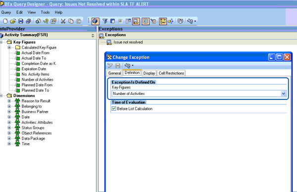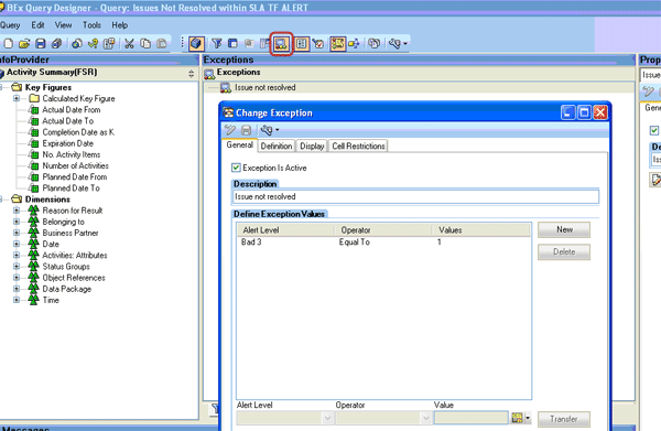 As you can see in Figure 3, the query you open is now available in BEx Query Designer to define exceptions.